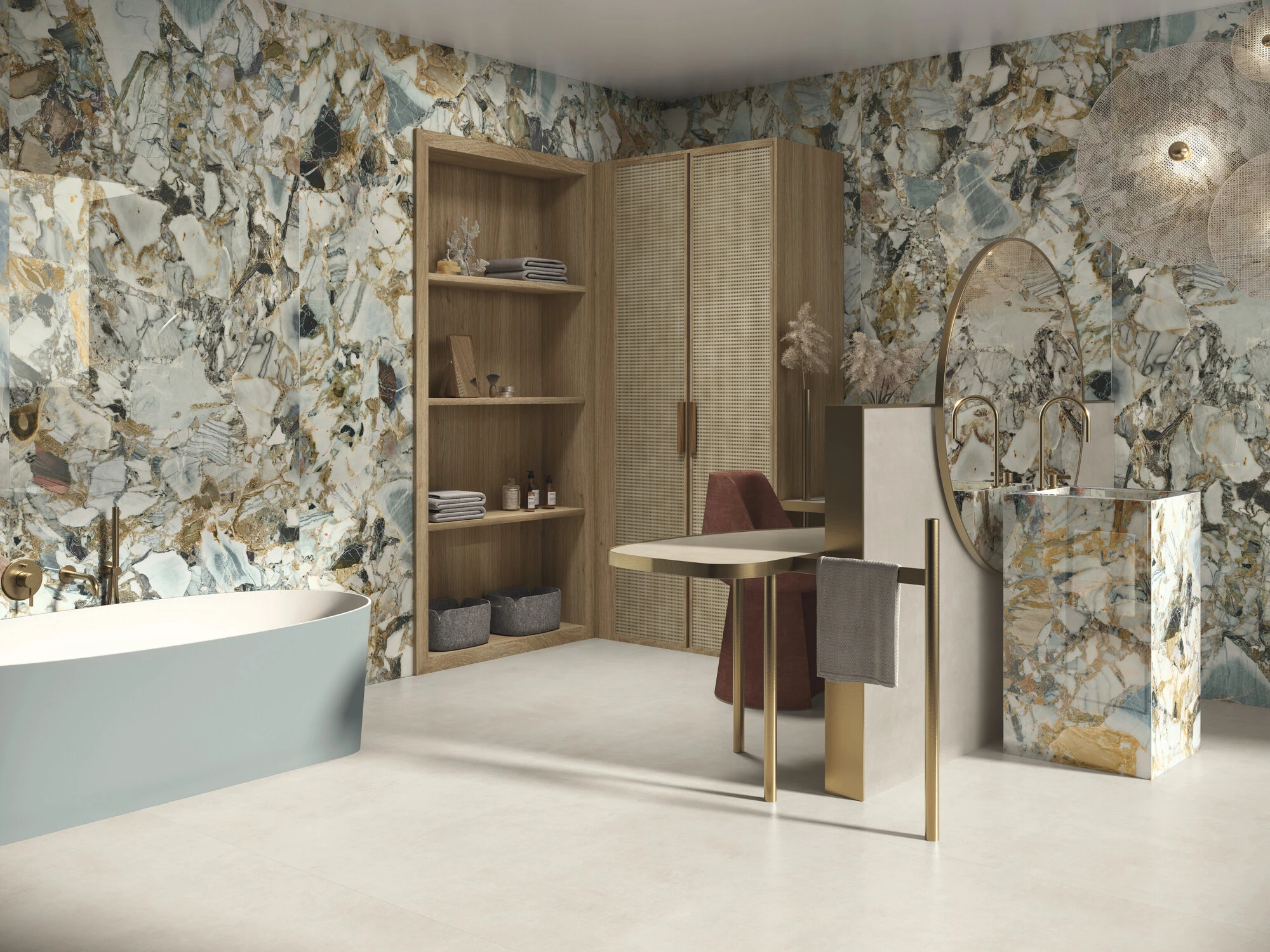Az Ape Detria termékcsalád a White Beauty márvány ikonikus textúráját ötvözi egy precíz exotikus érintéssel, ami tökéletesen illeszkedik az enteriőr kőtrendekhez, és kristályosodik meg a fantasztikus Detria kollekcióban. Ez a Laoszból és Thaiföldről kinyert természetes kőzett mintázata modern és sokoldalú esztétikához igazodik. A fehér, szürke kövek, valamint a zöld és fekete árnyalatok összefonódnak, hogy természetes műalkotást és meleg, kitörő dimenziót alkossanak, felidézve a Távol-Keletet és egyedülálló és organikus kifejezésben ötvözve az időtlent a kortársal.