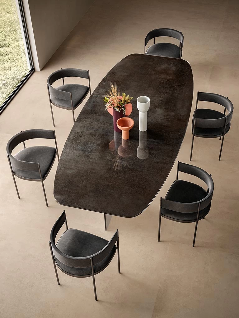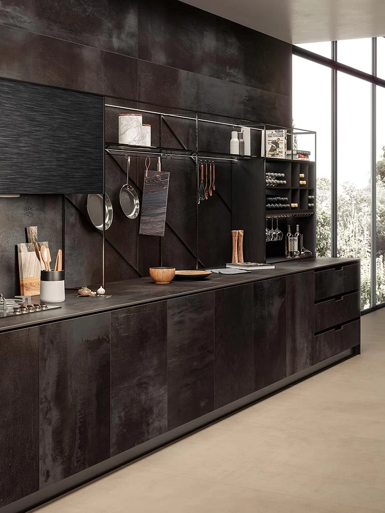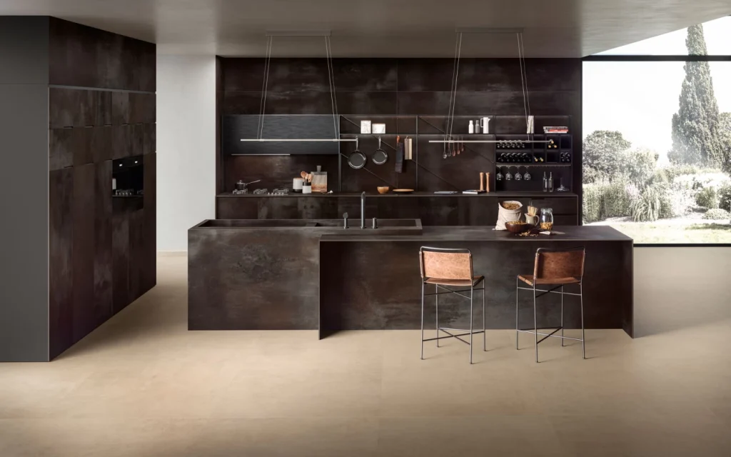 Az Atlas Plan Blaze Iron fémes hatású porcelán stoneware lap ideális a konyhai munkalapok, szigetek, asztalok, ajtók, csempék és falak burkolására. A munka látványereje modern és hangulatos környezeteket teremt. A fémes hatású porcelán csempék, a Blaze Iron matt lapot a Boost Pro Clay-al párosítják, amelyet a padló burkolására használtak. Az Atlas Plan lap ipari esztétikája semleges árnyalatú anyagokkal és városi ihletésű tárgyakkal párosul egy olyan helyiségben, amely erős és jellegzetes vonzerővel bír.