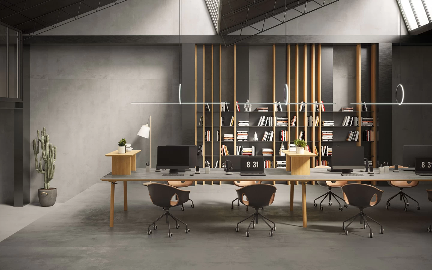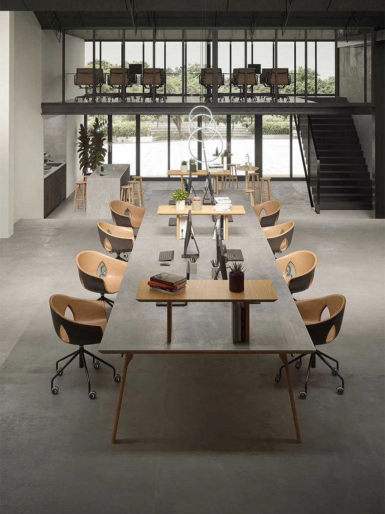 Az Atlas Plan Boost Grey betonhatású stoneware lapja különböző méretekben és vastagságokban elérhető. Ideális belső vagy külső terek bútorozásához magán- vagy közületi környezetben, ez a felület használható konyhapultok, fürdőszobai mosdópultok, bár/étterem pultok kialakítására. A Boost Grey: az üzleti környezet hangsúlyozza, hogyan lehet a lapot használni pultokhoz, padló- és falburkolatokhoz, egy szürke, betonhatású összkép kialakításához. Az eredmény egy tiszta, elegáns légkör, melyet a fa felhasználásával finom kontrasztok tesznek izgalmassá. A Boost Grey Hammered befejezés – 6 és 12 mm vastagságban – mellett a Boost Tarmac, egy másik betonhatású termék az Atlas Plan palettájáról, szintén alkalmazásra került.