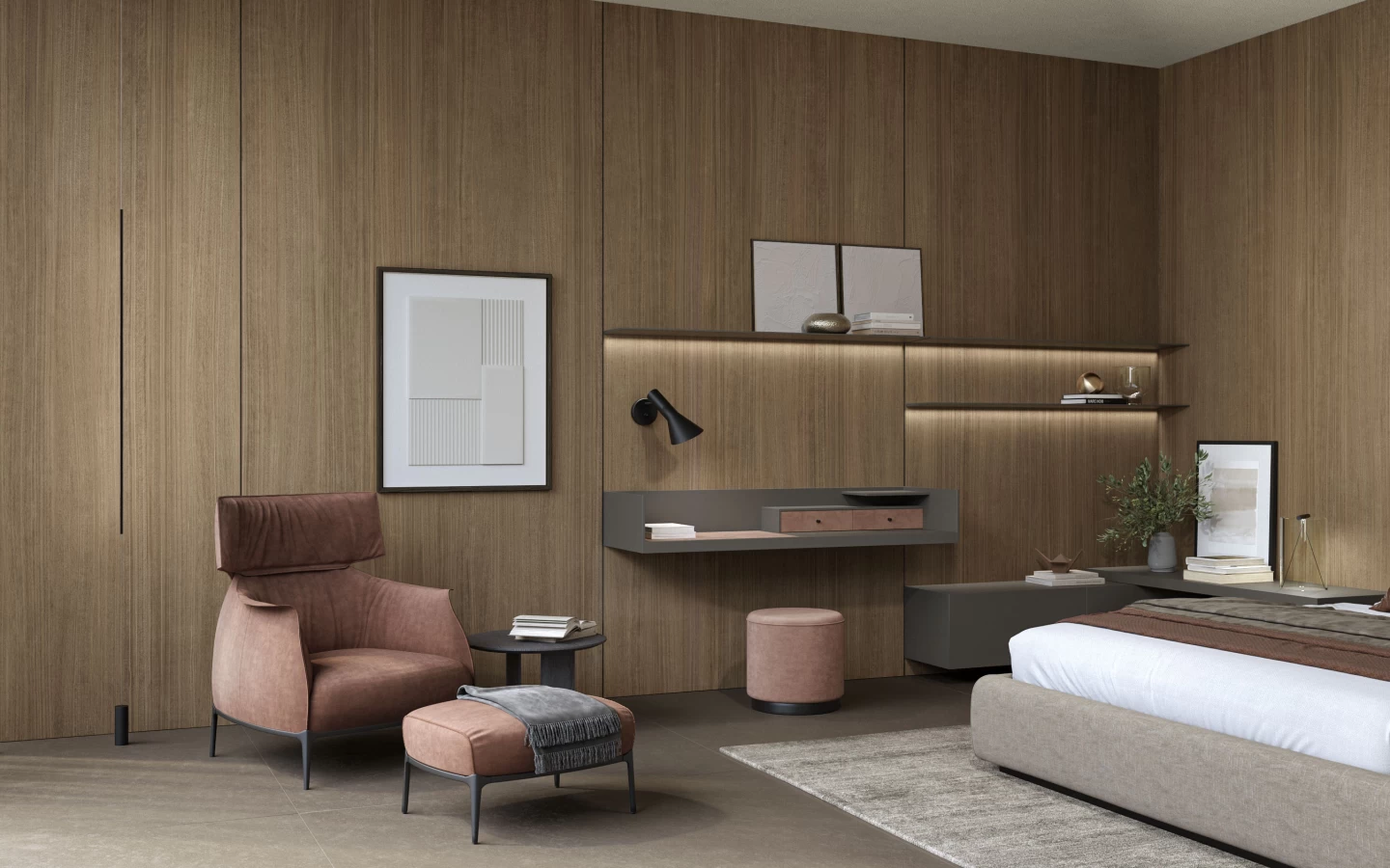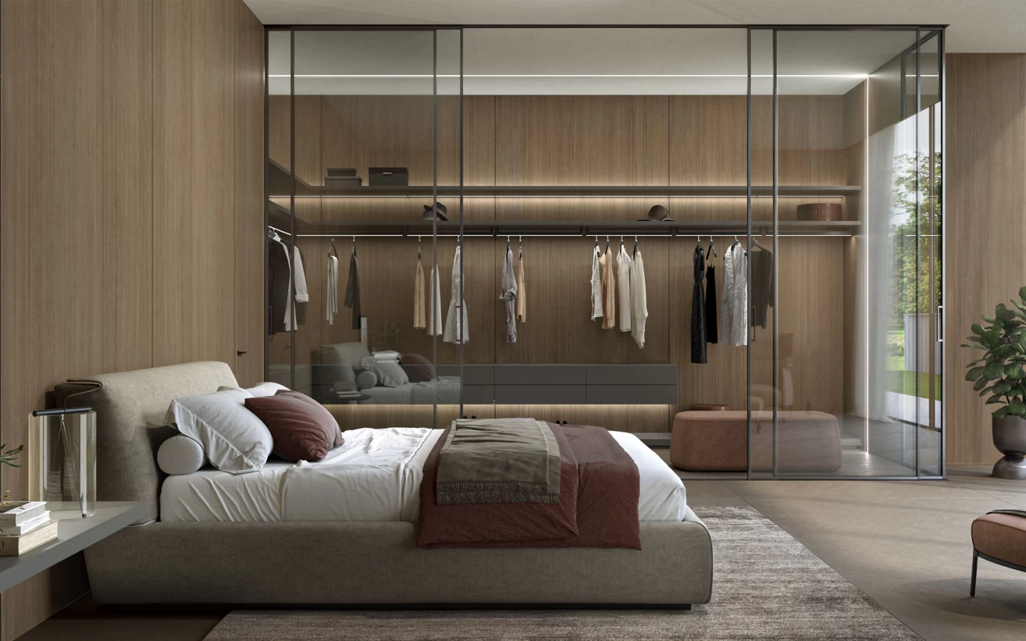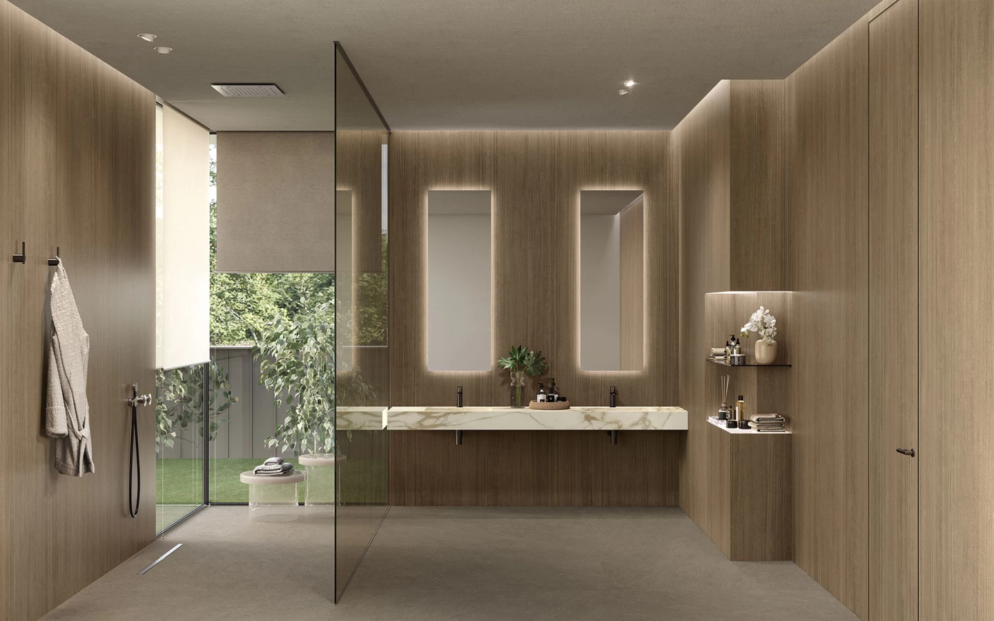 Az Atlas Plan Noce Canaletto nagyméretű csempéi tökéletesen illeszkednek mind a lakossági, mind a kereskedelmi terekbe, köszönhetően textúrázott, természetes stílusuknak. Megörökítik a finom faesszenciát, melegséget és karaktert kölcsönözve a környezetnek; így ideálisak olyan terek számára, amelyek egy csipetnyi autenticitást és kényelmet igényelnek anélkül, hogy lemondanának a kortárs, kifinomult tervezésről. Ebben a hálószobában a Noce Canaletto nagyméretű lapjai a falakat borítják, körülölelve a finom erezetekkel és intenzív árnyalattal, amelyek melegséget sugároznak. Ez a fa az impozáns, beépített gardróbszekrényekben is folytatódik, biztosítva a vizuális összhangot és harmóniát az általános tervezésben. A magas minőségű anyagok választása a minimalistább megközelítéssel párosul, ami autentikus és kényelmes légkört kölcsönöz a szobának, tökéletes azoknak, akik a nyugalom oázisát keresik otthonuk szívében.