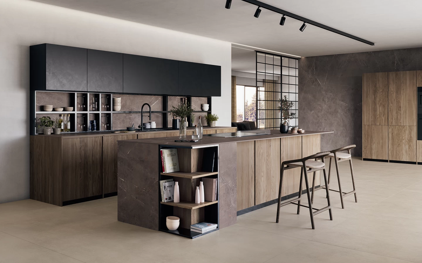 Az Atlas Plan Precious Brown termékcsalád elegáns alternatívát kínál nagy felületek burkolására és exkluzív bútorelemek létrehozására. Esztétikája sikeresen illeszkedik számos környezetbe, beleértve üzleti tereket, a vendéglátóipart és lakókörnyezeteket is. Ebben a kifinomult konyhai tervezésben a Precious Brown eleganciája a falak, a sziget és a hátfal burkolatán keresztül mutatkozik meg, így egy olyan légkört teremtve, tele kifinomult részletekkel. A Boost Balance Ash padló meleg és egységes szürkéje tökéletes kontrasztot teremt, kiemelve a nagyméretű Precious Brown lap szépségét. A fa bútorelemekkel való kombináció természetes és hangulatos jegyet ad, egy harmonikus és invitáló konyhát teremtve, ahol a funkcionalitást az elegancia ötvözi.