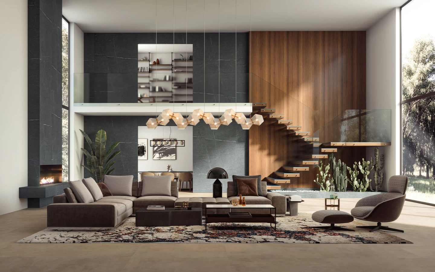 Az Atlas Plan Soapstone Dark termékcsalád nagyméretű lapjai a Natura-Body Tech technológiával készültek, ami lehetővé teszi teljes testű porcelánlapok létrehozását. A Soapstone Dark ajánlott felület a falak és a bútorok, például az asztalok, konyhai munkalapok, fürdőszobai mosdólapok és mosdók burkolásához. A szürke kőhatású porcelánlapok Soapstone Dark Hammered by Atlas Plan központi szerepet kapnak a nappaliban, sokoldalú felület, amely számos alkalmazáshoz alkalmas. A padlóburkolat kiválasztott borítása a matt Boost Pro Clay.