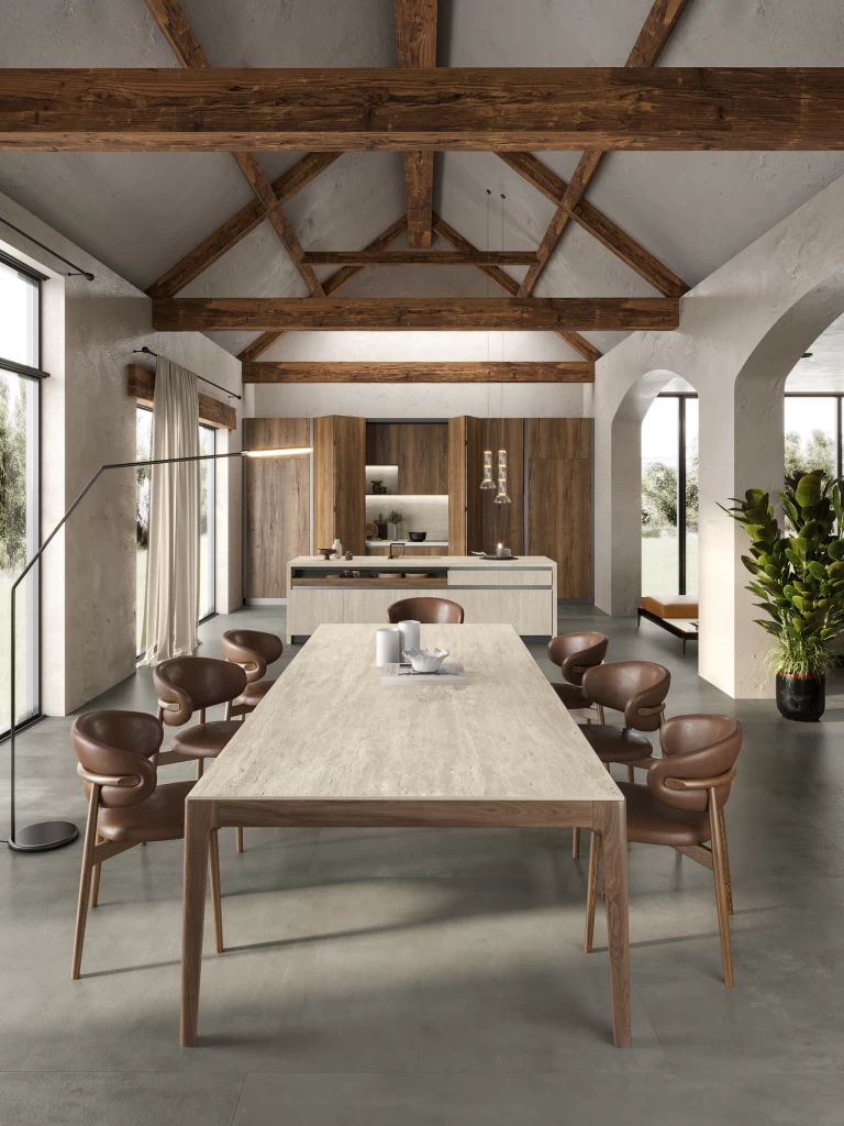 Az Atlas Plan Travertino Pearl termékcsalád nagy kerámia felületének meleg árnyalatai tökéletesen illeszkednek minden környezethez: lakóépületektől a kereskedelmi projektekig, Horeca terektől az üzleti terekig. A kopásállóság és a kőporcelán kompaktsága ideálissá teszi munkalapok, konyhapultok, csempék, falburkolatok és légáteresztő homlokzatok borításához. Lenyűgöző javaslat modern ízlésű és dizájnnal rendelkező terekhez. Travertino Pearl márványhatású porcelán csempe: egy nagy, modern érzetű tér, ahol a Travertino Pearl-t használták a konyhasziget borítására és a konyha hátsó falának, valamint folytonosságban az asztallapra. Az ellentétes kombináció fa és a nagy Boost Smoke betonhatású lapokkal a padlón, fokozza a hely egyedi azonosságát és karakterét.
