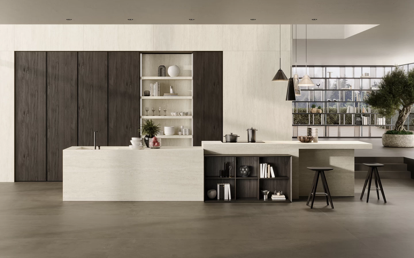 Az Atlas Plan Travertino White termékcsalád nagy Travertino White lapja tökéletes választás számos felhasználási területre: ideális a látványos padlóburkolatokhoz, falak központi eleméhez vagy jellegzetes bútorok létrehozásához. A anyag tartóssága lehetővé teszi kültéri és beltéri használatát, értékesebb esztétikát kölcsönözve bármely térnek. A Travertino White sokoldalúsága nyilvánvaló az enteriőrök tervezésekor. Ebben a tágas konyhában a lapok díszítik a falakat és a polcokat, világos, barátságos tereket teremtve. A Travertino White-ból készült konyhapultok és sziget lábazatai hangsúlyozzák a tér vizuális folytonosságát és funkcionális eleganciáját. Az ábrázolás befejezéseként a nagy Boost Pro Taupe lap tökéletes harmóniában van a Travertino White színvilágával és textúrájával, kiegészítve azt.