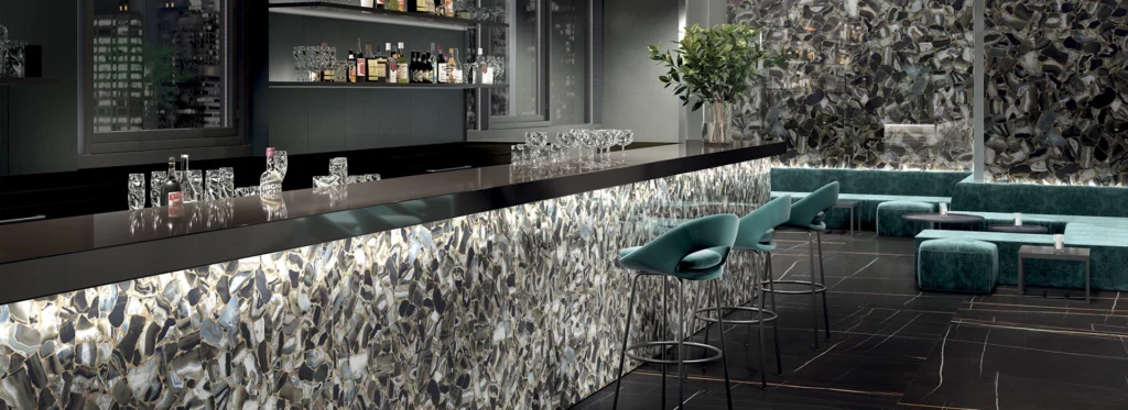 Az Agata Maxfine termékcsalád gyönyörű egyedi márványhatású felületeket kínál. Barna, bézs és kék színekben érhető el fényes felülettel. Méretük: 300×150 cm.